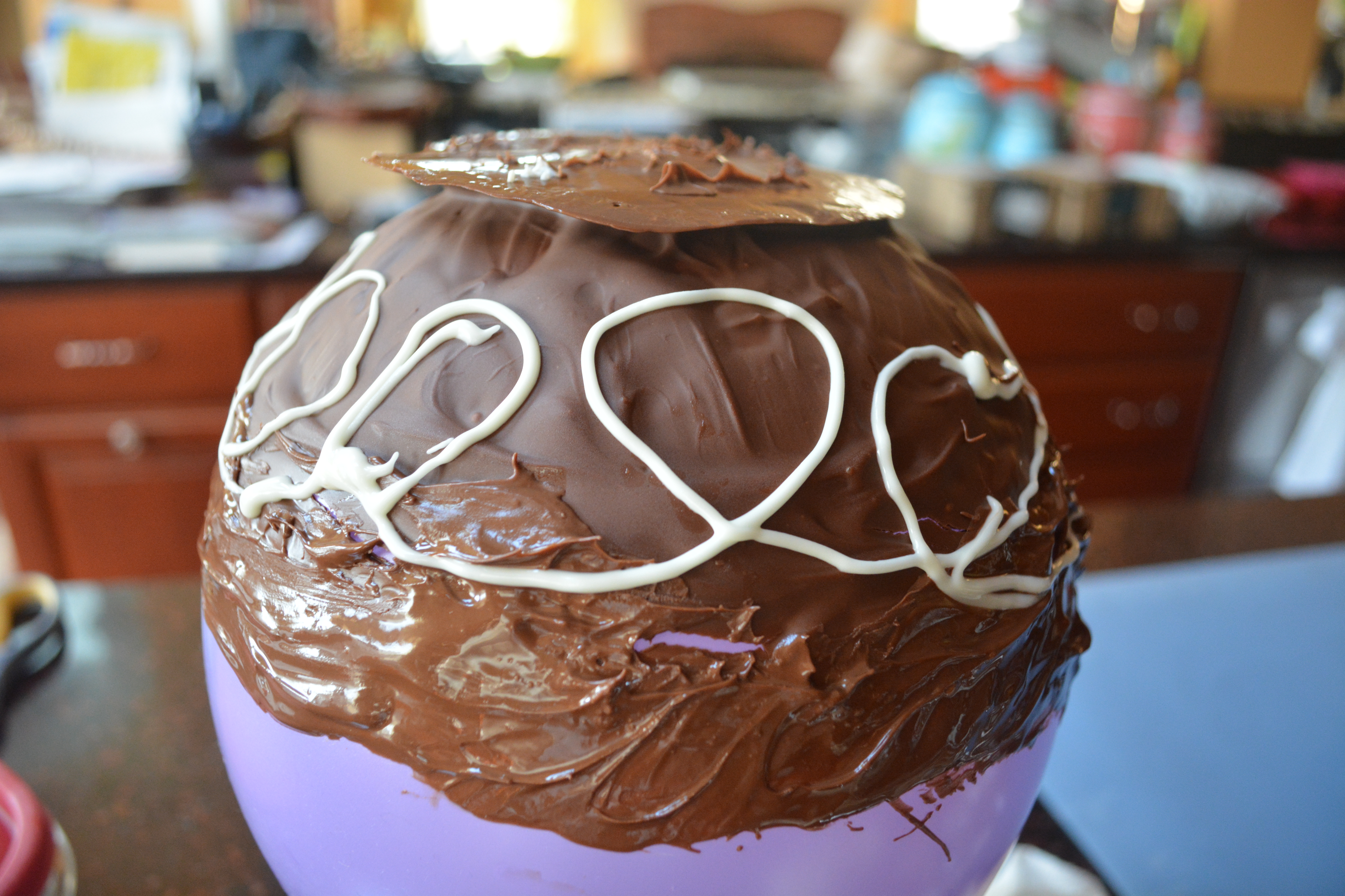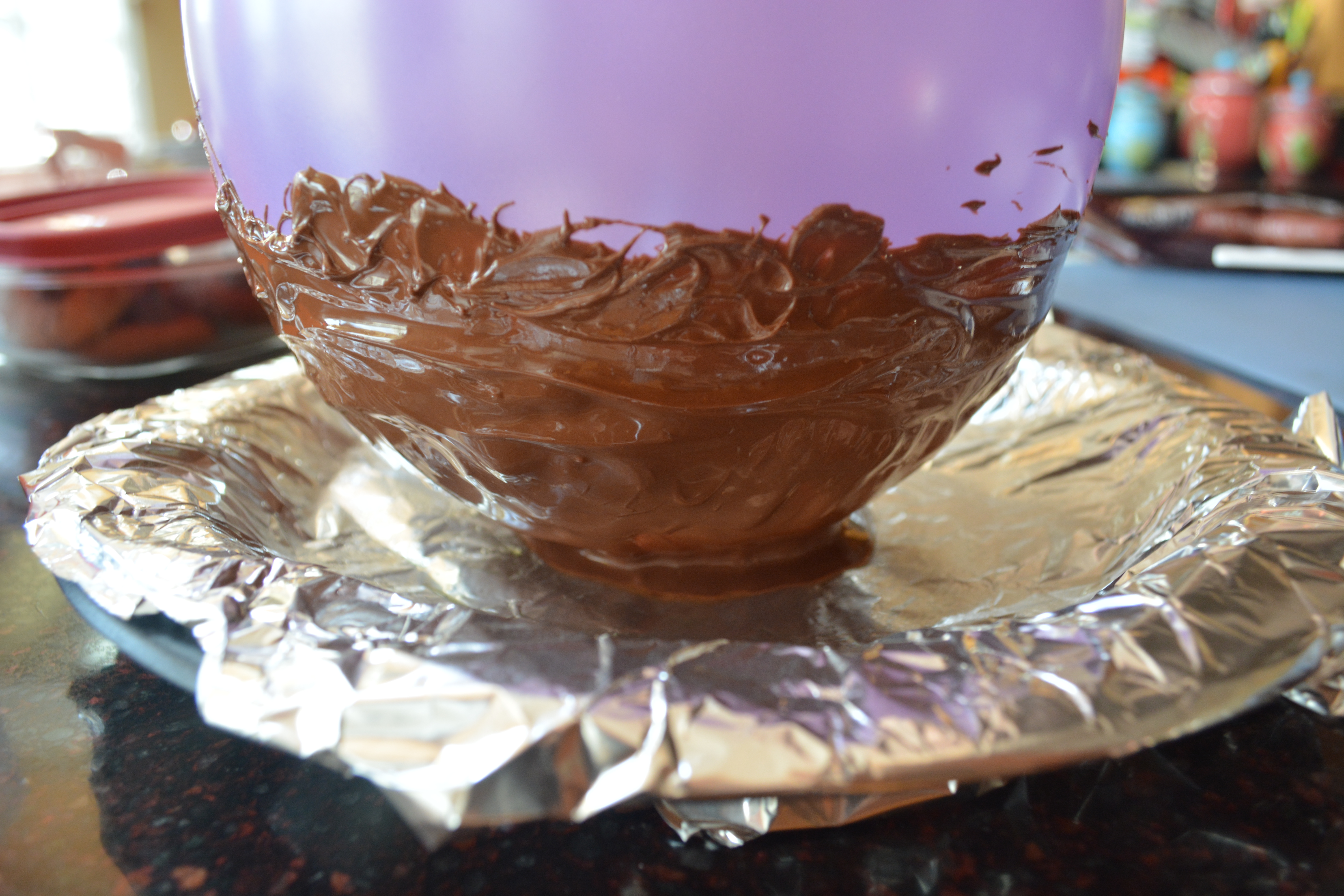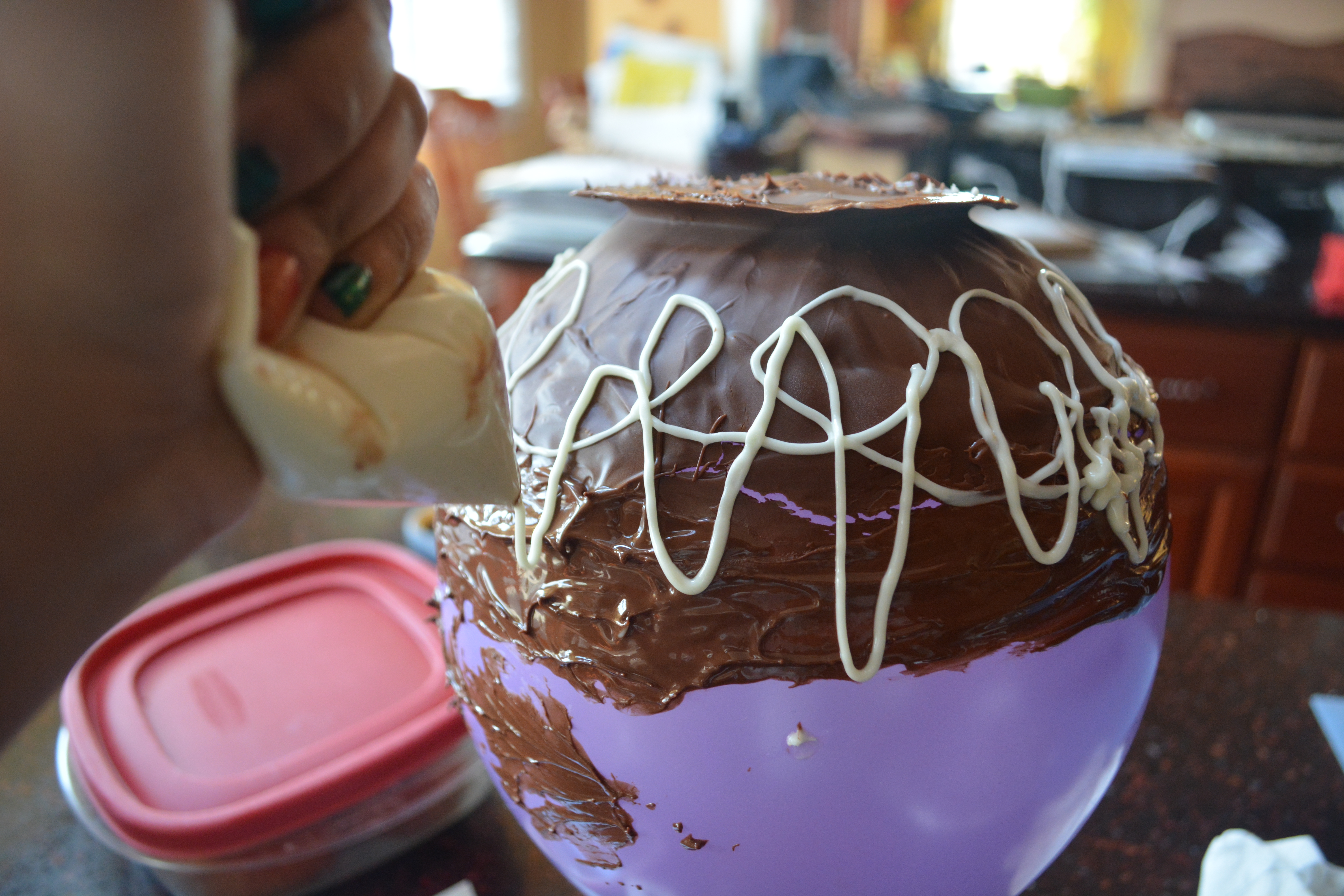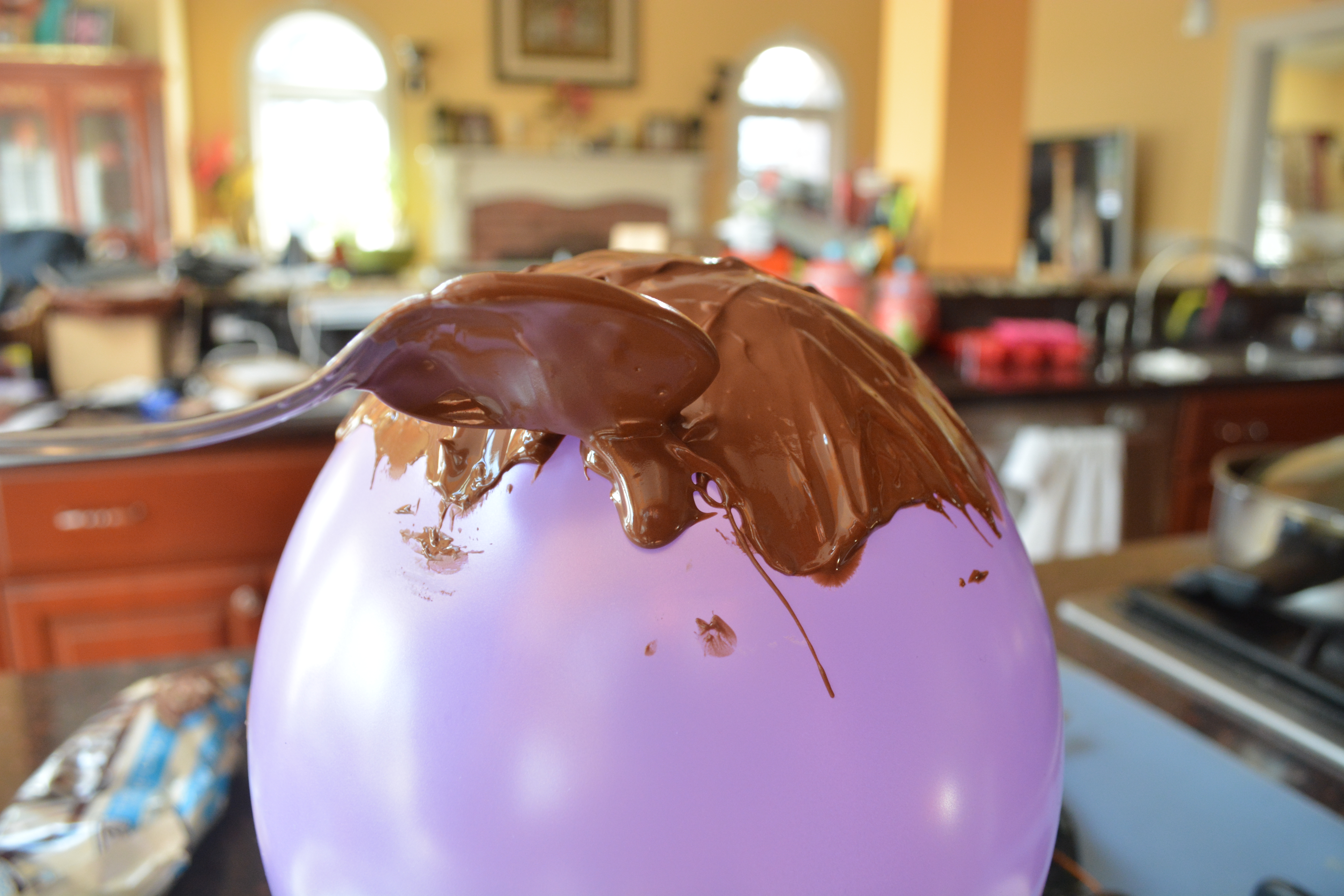 Then start to cover your balloon evenly with the melted chocolate. I made the mistake of making my bowl huge so don’t do that. Place the balloon on the dollop once you finish covering it.