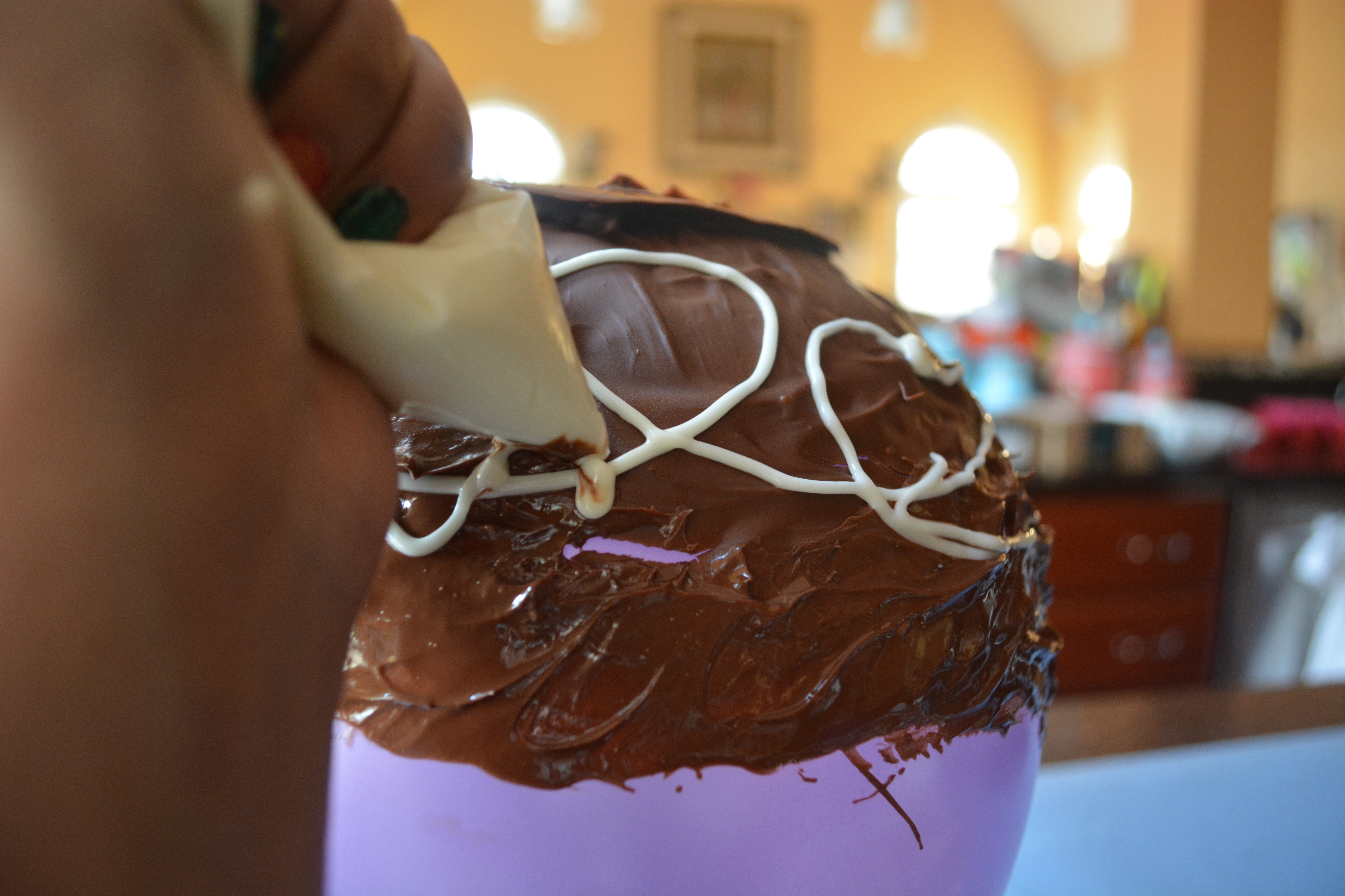 This is where I tried to be artsy and pipe fun designs onto the bowl. I put the melted vanilla into a Ziplock bag and cut a small hole in the corner so I could pipe.